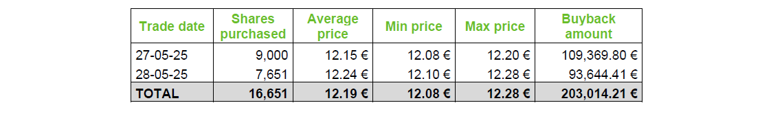 In the framework of this share buyback program, IBA repurchased 16,651 IBA shares on Euronext Brussels in the period from May 27th, 2025 up to and including May 28th, 2025, as follows: