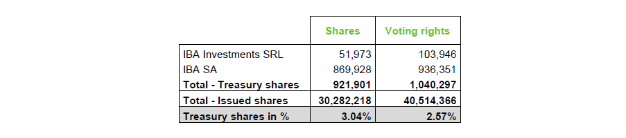 The total number of shares purchased under this program therefore amounts to 556,349, following this seventh week of execution. As a result, the current situation with respect to treasury shares (held directly by IBA SA and indirectly through its subsidiary IBA Investments SRL) is the following :